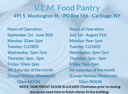 The VEM Food Pantry has a Facebook page as well to help with updates.